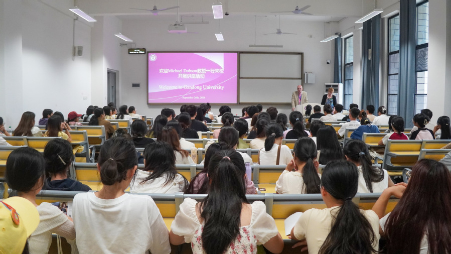 当日下午,多布森教授夫妇开展了主题为《跨越时空的莎士比亚与汤显祖》的学术讲座,吸引了百余名师生前来聆听。讲座中,教授及其夫人就莎士比亚与汤显祖的经典作品及相关雕塑艺术进行了深入讲解,并与在场师生进行了互动交流。讲座学术氛围浓厚,在热烈的掌声中圆满结束。